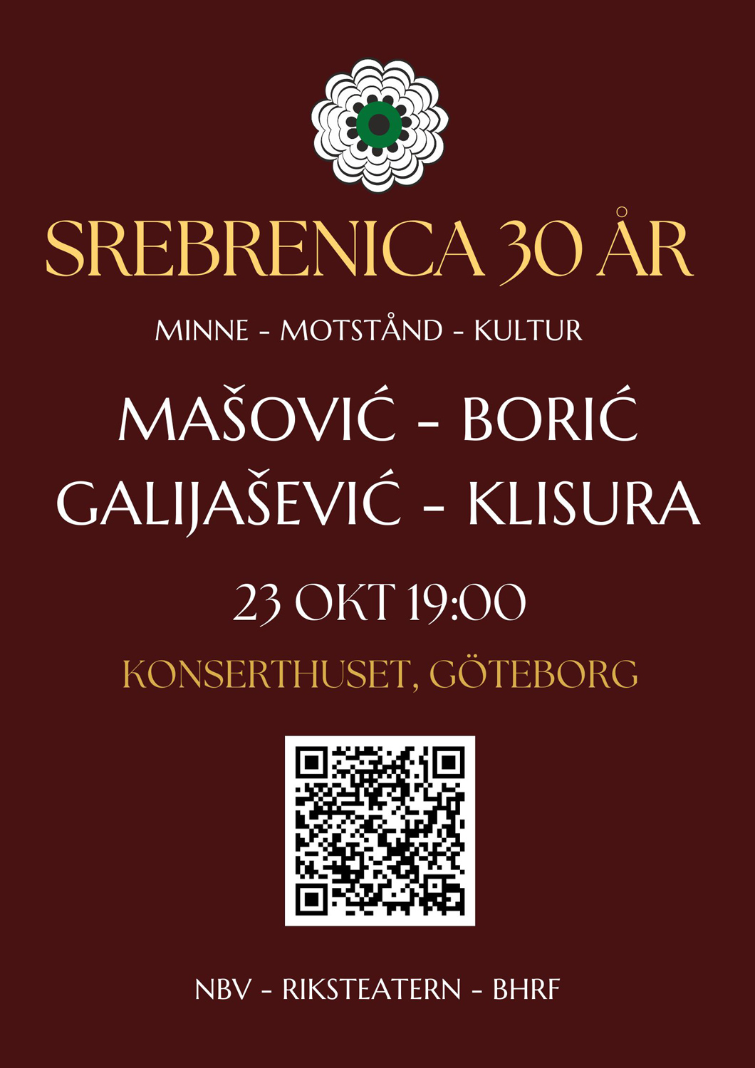 Savez bh. udruženja u Švedskoj (BHRF) organizuje poseban program ”Srebrenica 30 godina” u saradnji sa Švedskim zemaljskim pozorištem (Riksteater) i NBV-om, kao i organizacijama članicama NBV-a (IZBUŠ, Bemuf, BHSKF, BHKRF).